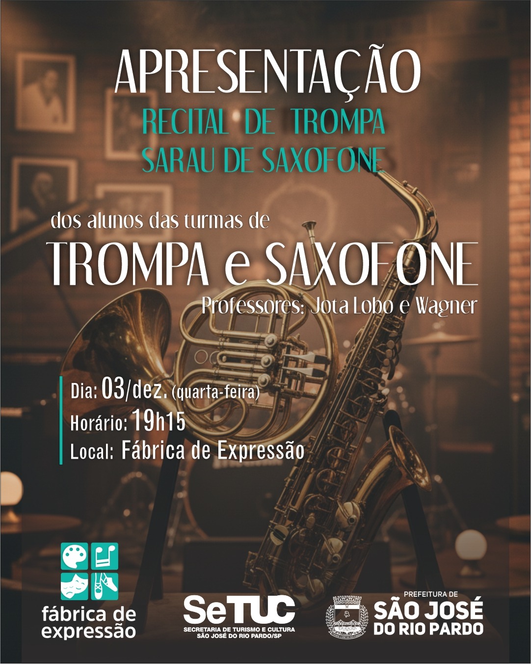 A Prefeitura Municipal de São José do Rio Pardo, por meio da Secretaria de Turismo e Cultura e da Fábrica de Expressão, tem a honra de convidar a todos para prestigiar os alunos das turmas de Trompa e Saxofone no evento